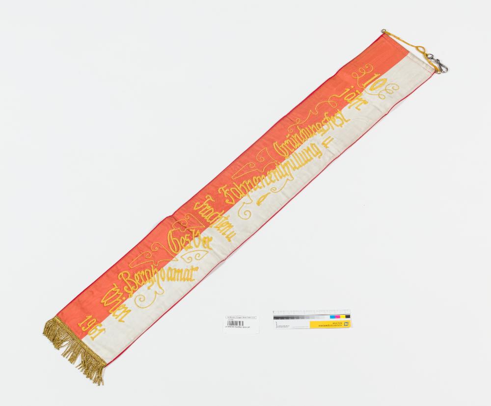 Rostrot/weißes Fahnenband aus Rips-Band mit gelbem Schriftzug in Schnurstickerei, Unterkante mit goldener Fransenborte besetzt. Rot hinterfüttert mit Vorstoß und aufgenähtem Firmenetikett, Querstange mit aufgebogenen Enden, gelbe Kordel und Karabiner für die Montage.
