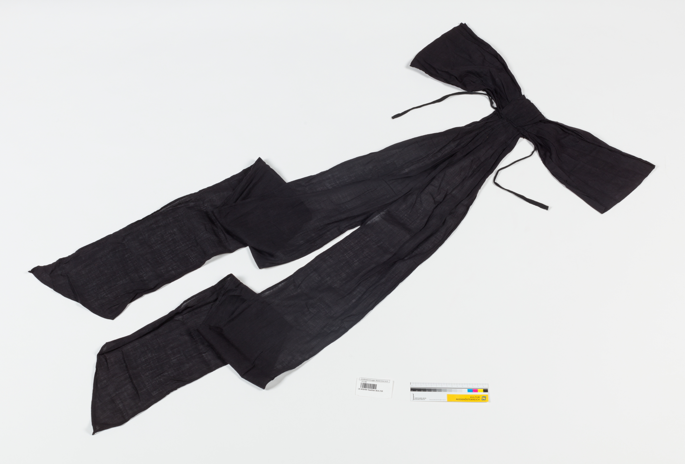 Schwarzer Trauerflor aus zwei langen Bändern die an der Oberkante zu einer Masche mit langen Schleifen genäht sind, Köperband zum Festbinden.