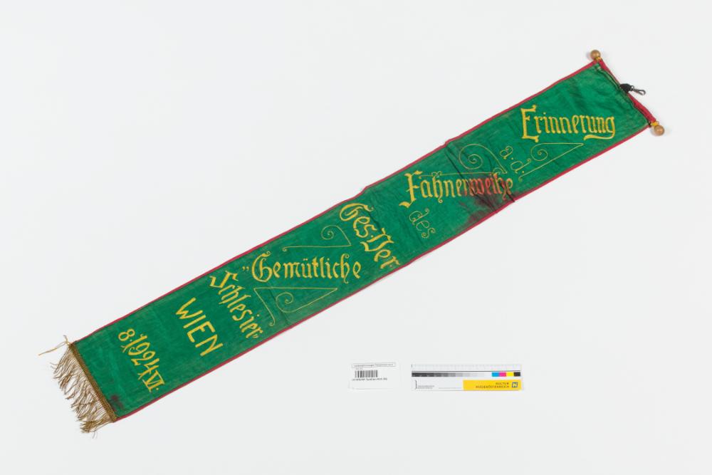 Schriftzug: Erinnerung a.d. Fahnenweihe des Ges. Ver. "Gemütliche Schlesier", Wien 8.1924.VI. Firmenstempel: Karl Timper, Atelier für Kunst […]stickerei, Wien, VI. Hirschengasse 20.