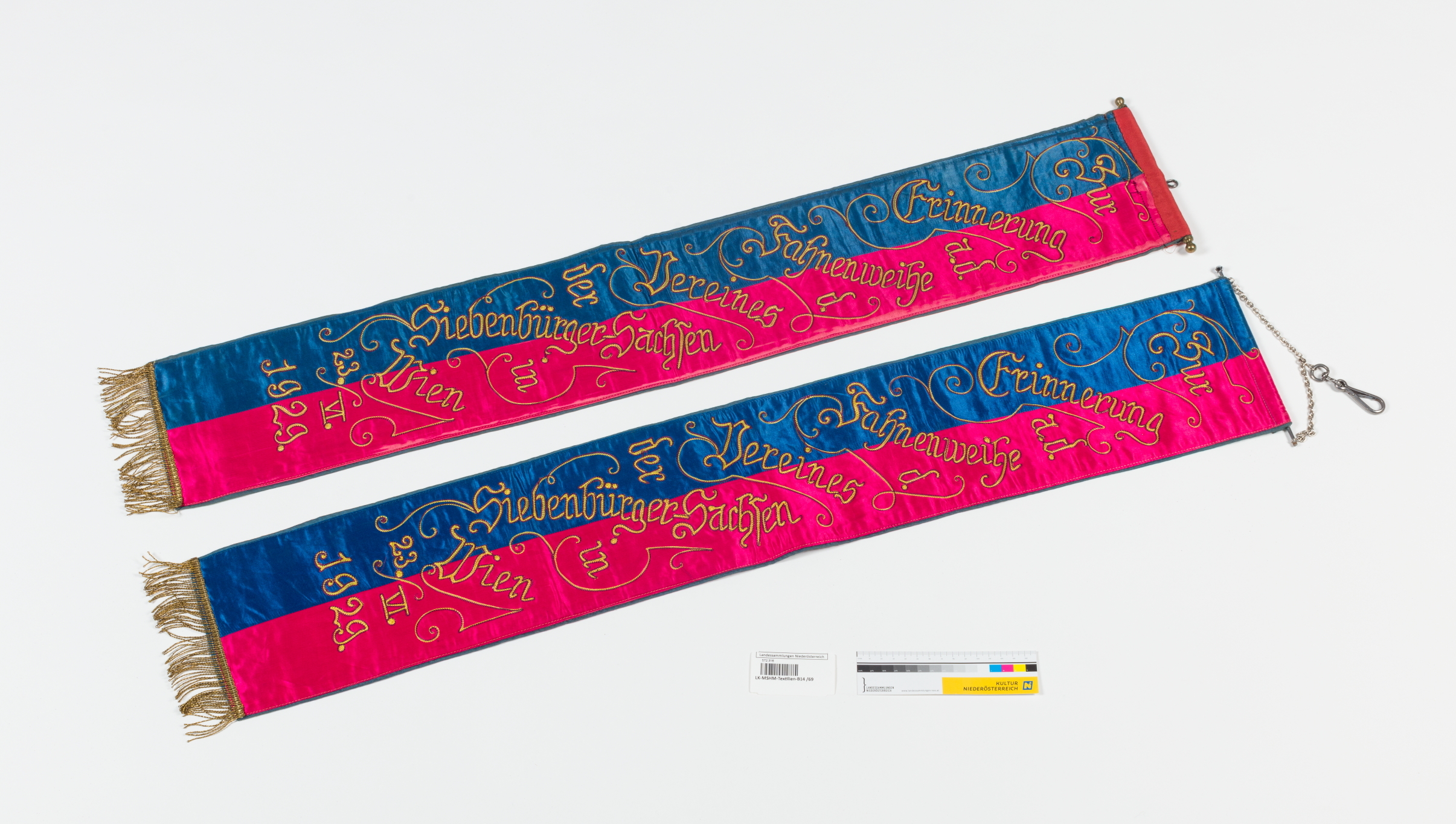 Schriftzug: Zur Erinnerung a.d. Fahnenweihe d. Vereins der Siebenbürger-Sachsen in Wien, 23. VI. 1929. Firmenetikett: Kunstanstalt für Vereinsfahnen und Paramente, Ladislaus German, Wien VII. Mariahilferstr. 96.