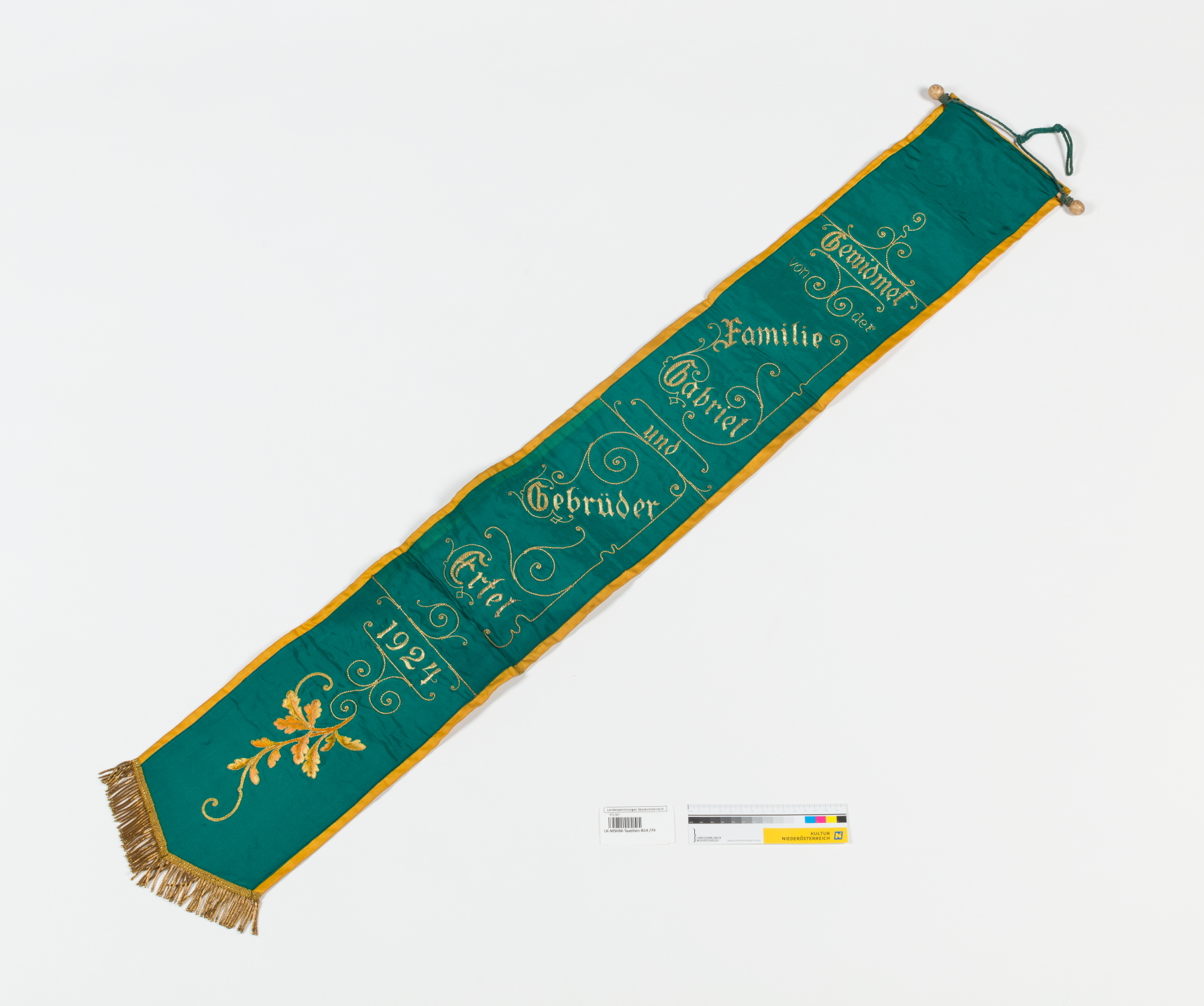 Schriftzug: Gewidmet von der Familie Gabriel und Gebrüder Ertel, 1924. Firmenetikett: Karl Timper, Atelier für Kunst & Goldstickerei, Wien, VI. Hirschengasse 20