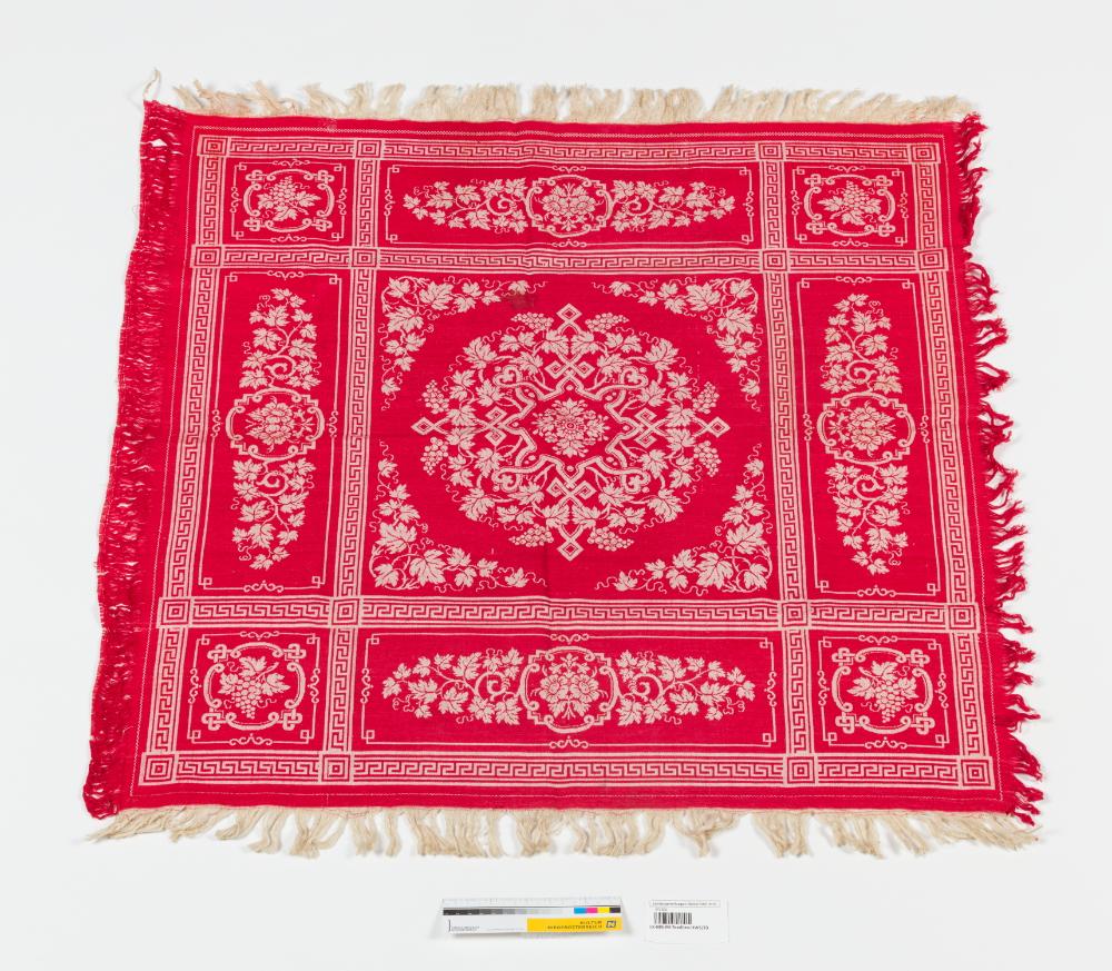 Rotes Damsttischtuch mit floral, ornamentalem Muster, mittige Rosette, umlaufende Bordüre mit Weinranken, -trauben und Mäander. Kett und Schußfäden laufen in rot/weiße Fransen aus, eine Seite mit Webekante.