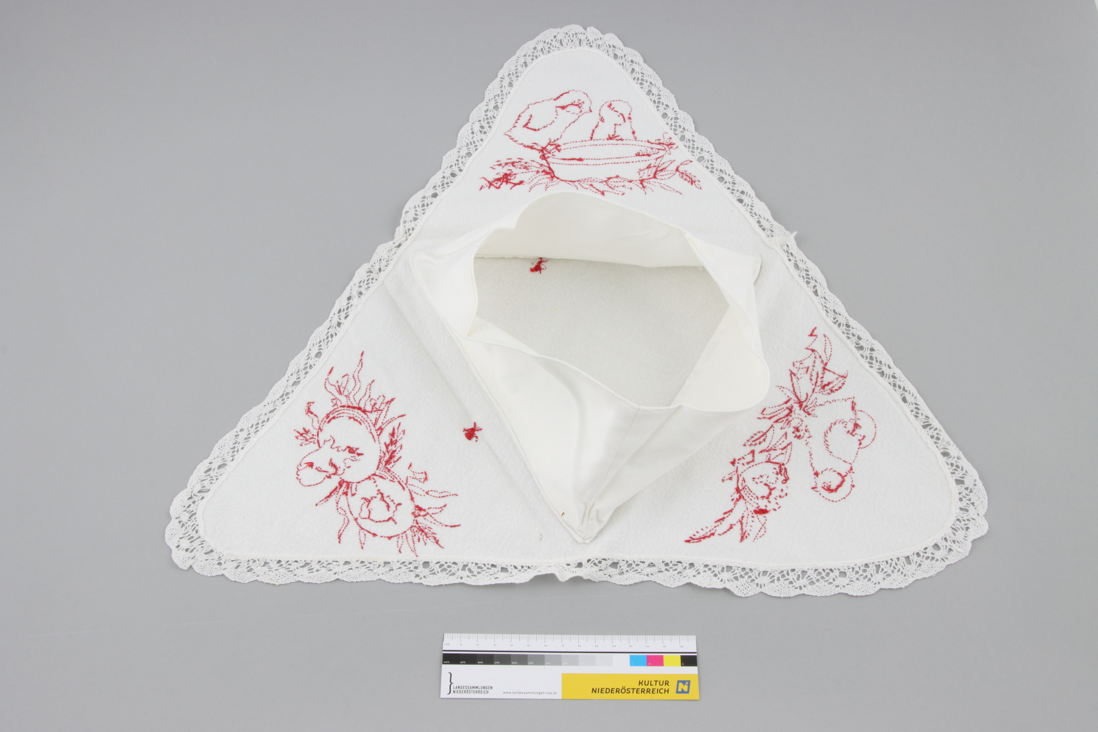 Dreieckiger Eierwärmer aus weißem Barchen mit drei Kücken und Eier Motiven in roter Stielstichstickerei, umlaufend mit Klöppelspitze besetzt. Innen Seitenwände im Dreieck zum Aufklappen.