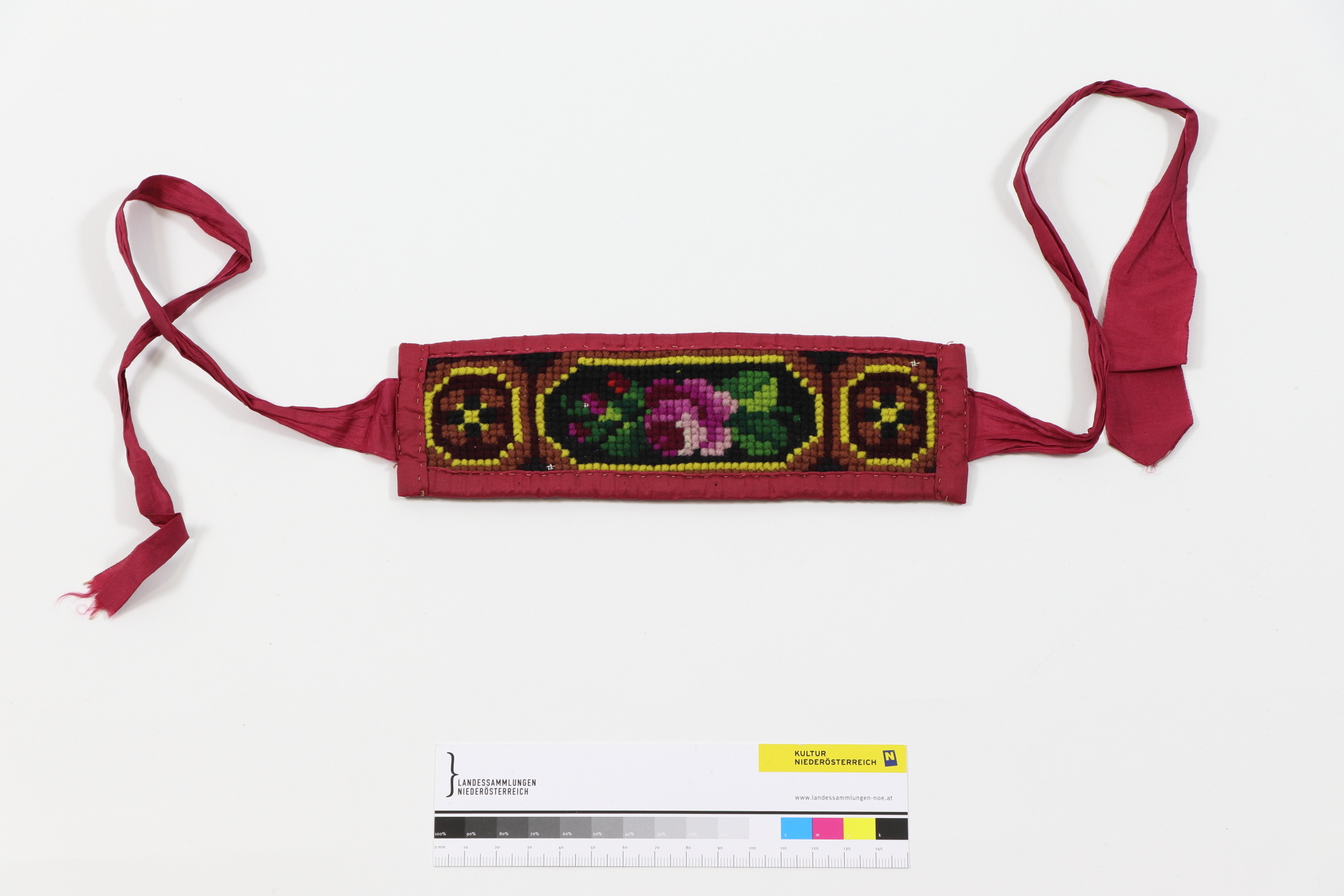 Floral-ornamentale Stickerei mit Rose in Kreuzstich, auf rote Seide aufgearbeitet, rote Bindebänder.