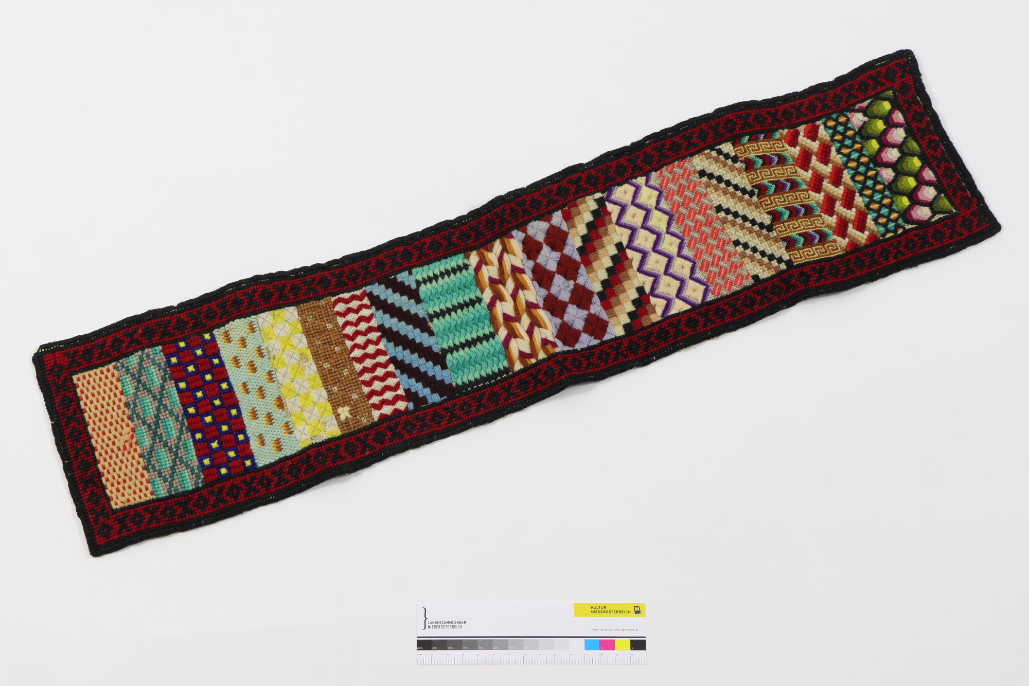 Bunter Strickmusterstreifen mit 19 verschiedene geometrische Musterflächen, Rot/Schwarz eingerahmt.