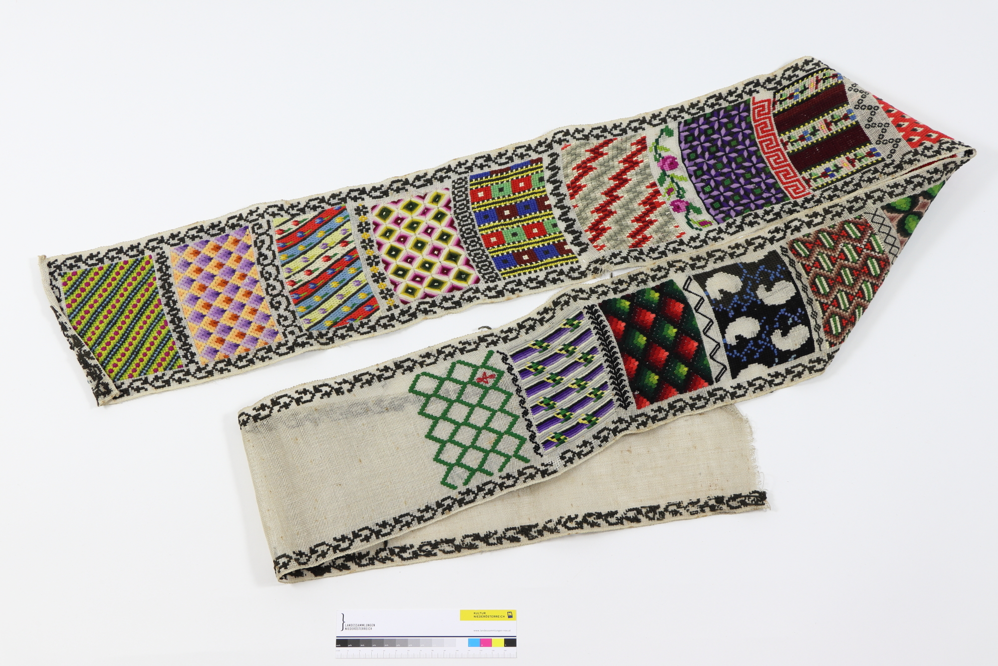 Bunter Stickmusterstreifen mit 15 verschiedenen Musterfeldern.