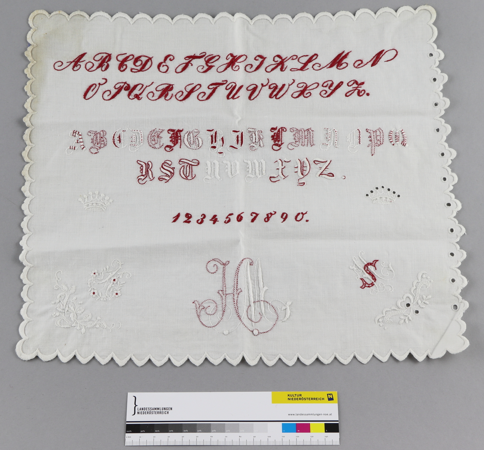 Weißes Stickmustertuch mit Alphabeth, Zahlen, Kronen und Eckenornamente in Rot/Weiß in Reliefstickerei, bebogte Kanten, Monogramm "HM".