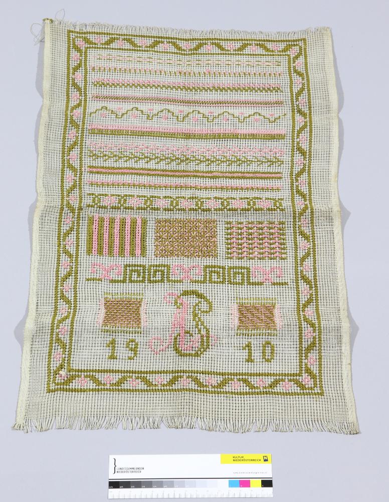 Stickmustertuch mit verschiedenen Bordüren- und Flächenmustern in Rosa und Grün.