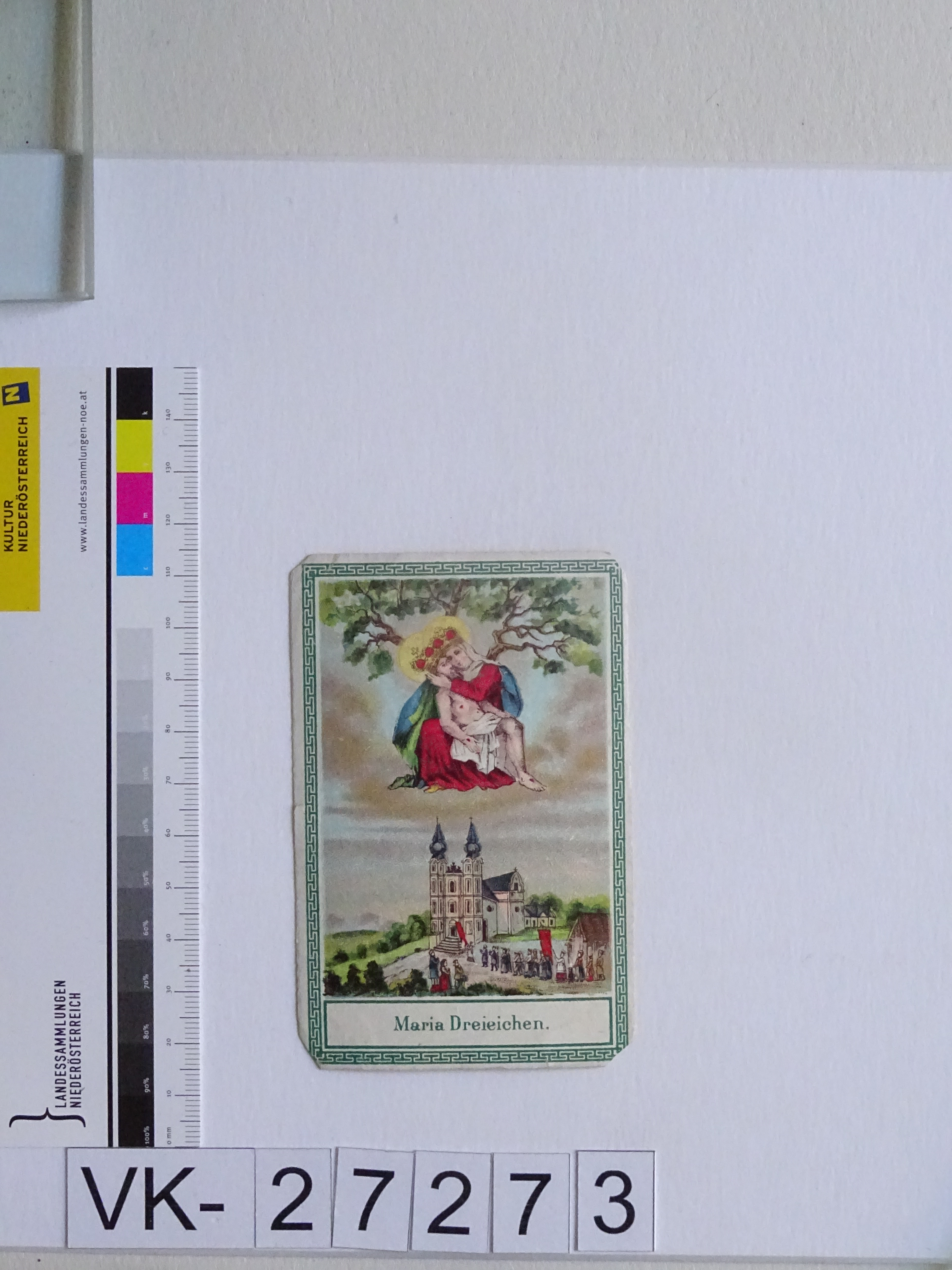 Maria Dreieichen; Vorderseite: Gnadenstatue = Pietà, Basilika; Rückseite: "Gebet zur Mutter Gottes"