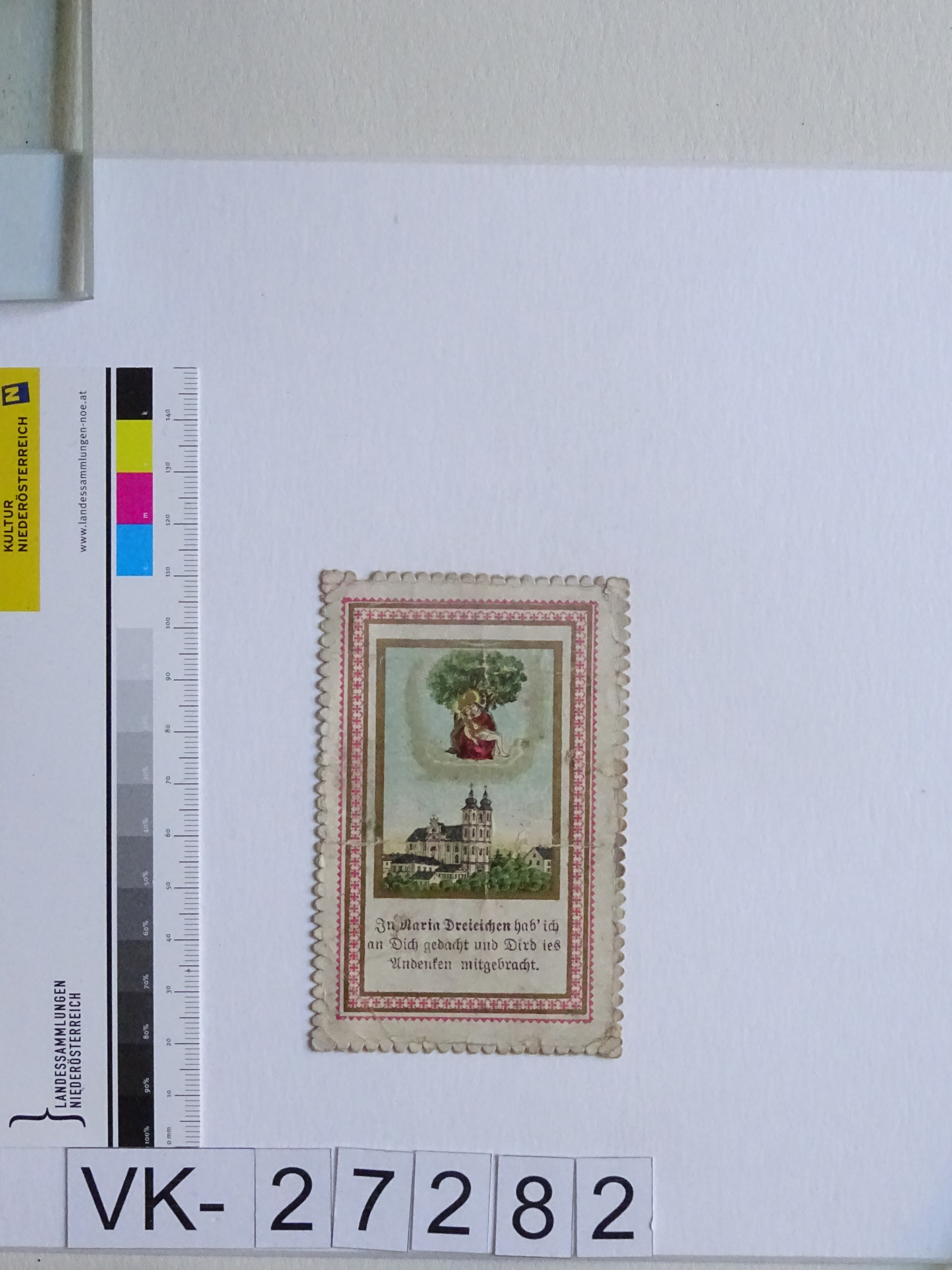 Maria Dreieichen; Vorderseite: Gnadenstatue = Pietà, Basilika, Spruch; Rückseite: "Gebet", "Franz Schemm, Nürnberg"