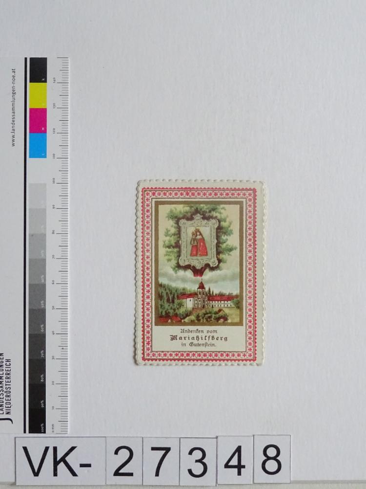 Mariahilfberg bei Gutenstein; Vorderseite: Gnadenbild = Maria mit Kind, Wallfahrtskirche; Rückseite: "Gebet", "Druckerlaubnis Bamberg 1903", "Franz Schemm, Nürnberg"