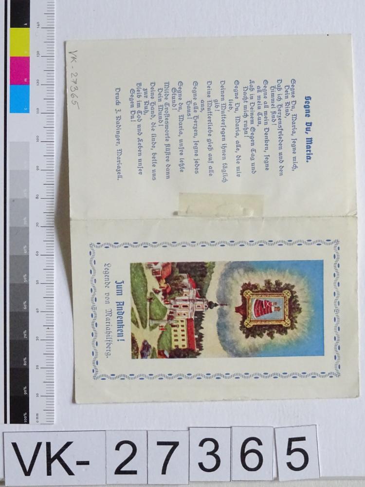 Mariahilfberg bei Gutenstein; gefaltet und geheftet; Vorderseite: Gnadenbild = Maria mit Kind, Wallfahrtskirche; Innenseiten: Gründungsgeschichte; Rückseite: Gebet "Segne Du, Maria"