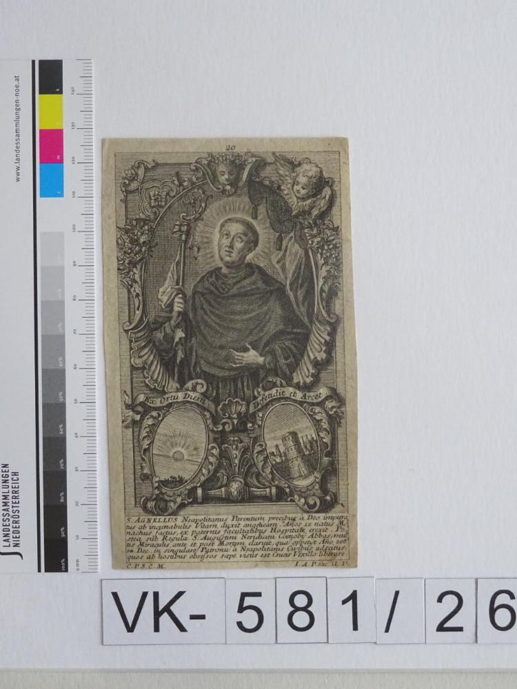 Hl. Angelus; Spruch, "C. P. S. C. M., I. A. P. exc. A. V."; Eintrag Inventarbuch: "Heiligenbildchen, Heilige: A"
