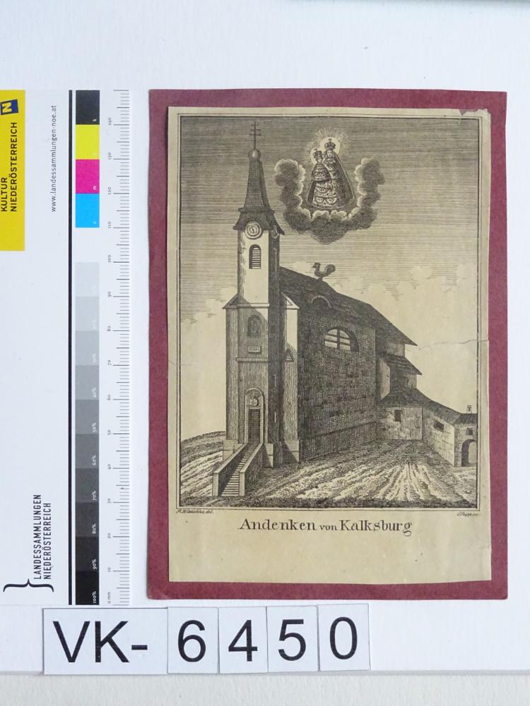 Kalksburg; Vorderseite: Gnadenstatue = Maria mit Kind, Wallfahrtskirche; "R. Wiatschka, del.", "C. Seipp,sc"; auf Karton verklebt; Eintrag Inventarbuch: "Andachtsbildchen, Lithografie koloriert"