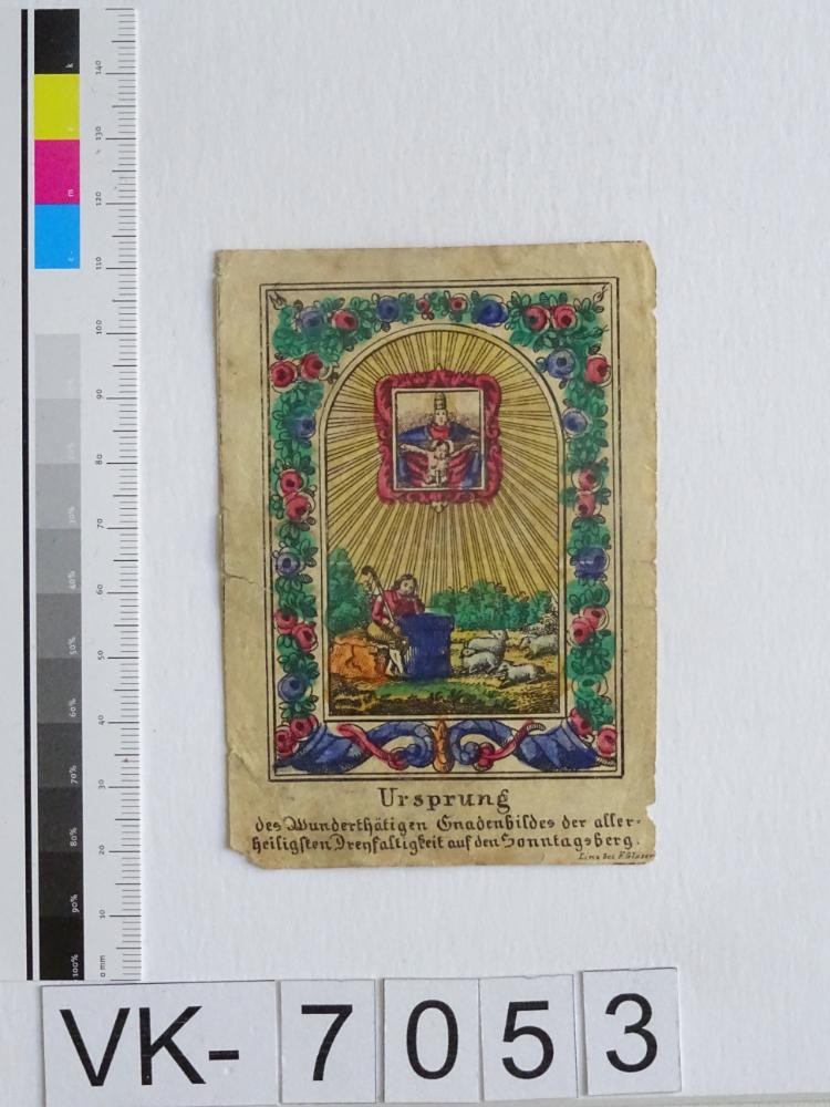 Sonntagberg; Vorderseite: Gnadenbild = Gnadenstuhl, Hirte mit Schaf, "Bei F. Glaser, Linz"; Eintrag Inventarbuch: "Andachtbild, Kupferstich, koloriert, Ursprung des wundertätigen Gnadenbildes der allerheiligsten Dreifaltigkeit auf dem Sonntagsberg, Golddr