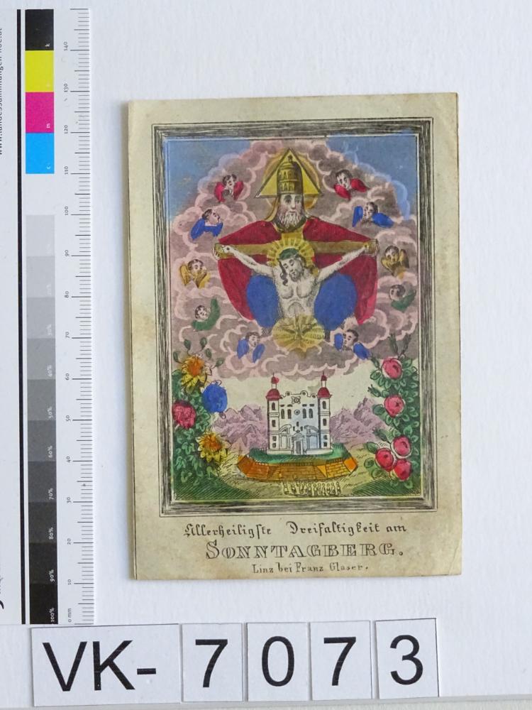 Sonntagberg; Vorderseite: Gnadenbild = Gnadenstuhl, Basilika, "Bei F. Glaser, Linz"; Eintrag Inventarbuch: "Andachtsbild, Stahlstich, koloriert, Sammlung Klar."
