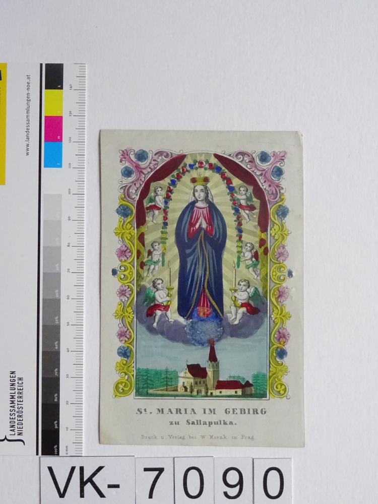 Sallapulka, "Maria im Gebirge"; Vorderseite: Gnadenstatue = Maria, Wallfahrtskirche, "Druck und Verlag bei W. Morak in Prag"; Eintrag Inventarbuch: "Andachtsbildchen, Slg. Klar."