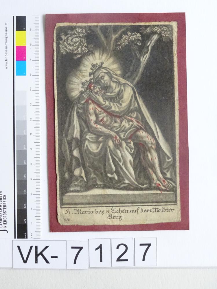 Maria Dreieichen; Vorderseite: Gnadenstatue = Pietà, "Maria bei den 3 Eichen auf dem Moldterberg"; verklebt auf Karton; Eintrag Inventarbuch: "Andachtsbildchen, Stich, koloriert, Slg. Klar."