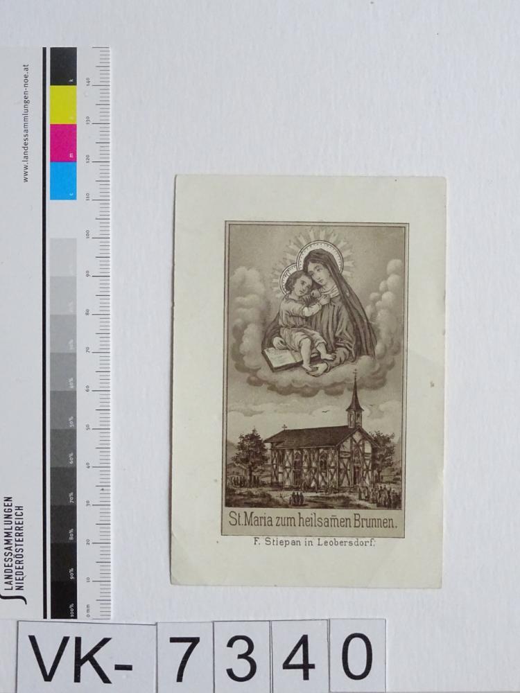 Leobersdorf, Maria zum Heilsamen Brunnen; Vorderseite: Gnadenstatue = Maria mit Kind, Wallfahrtskapelle, "F. Stiepan in Leopbersdorf; Rückseite: Gebet; Eintrag Inventarbuch: "Wallfahrtsbildchen, Sammlung Klar."