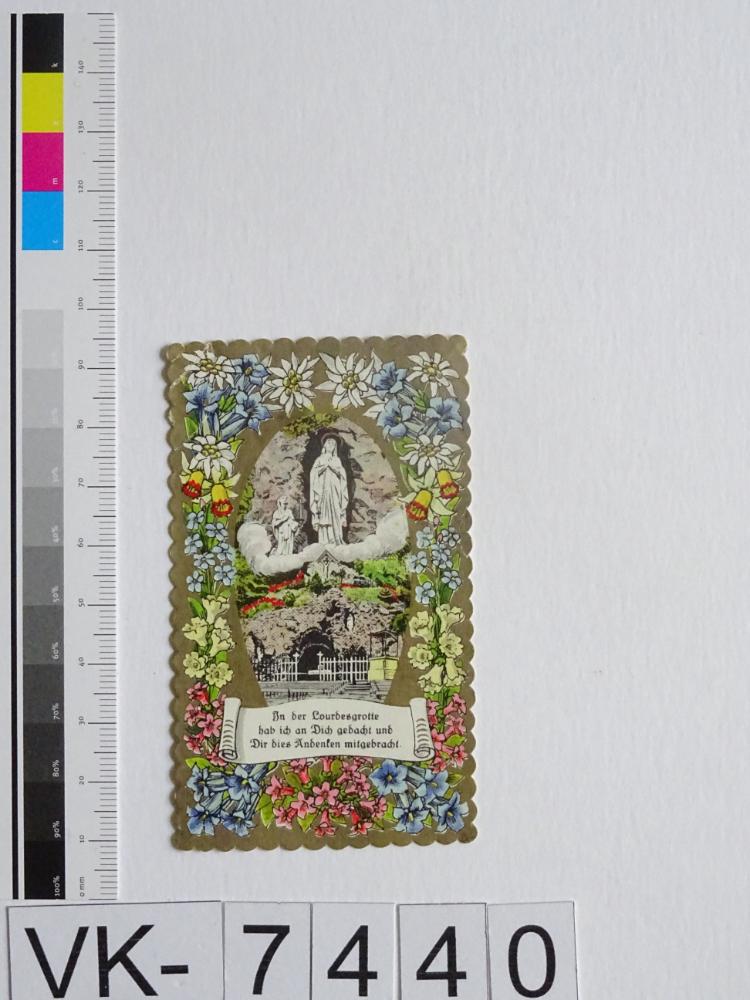 Maria Gugging; Vorderseite: Maria von Lourdes (Lourdesgrotte), Hl. Bernadette Soubirous, Blumen (Edelweiss, Enzian, Vergissmeinnicht, Glockenblumen); Rückseite: "Gebet an unsere liebe Frau von Lourdes, "3860/36", "Peter, Wien VI."; Eintrag Inventarbuch: "