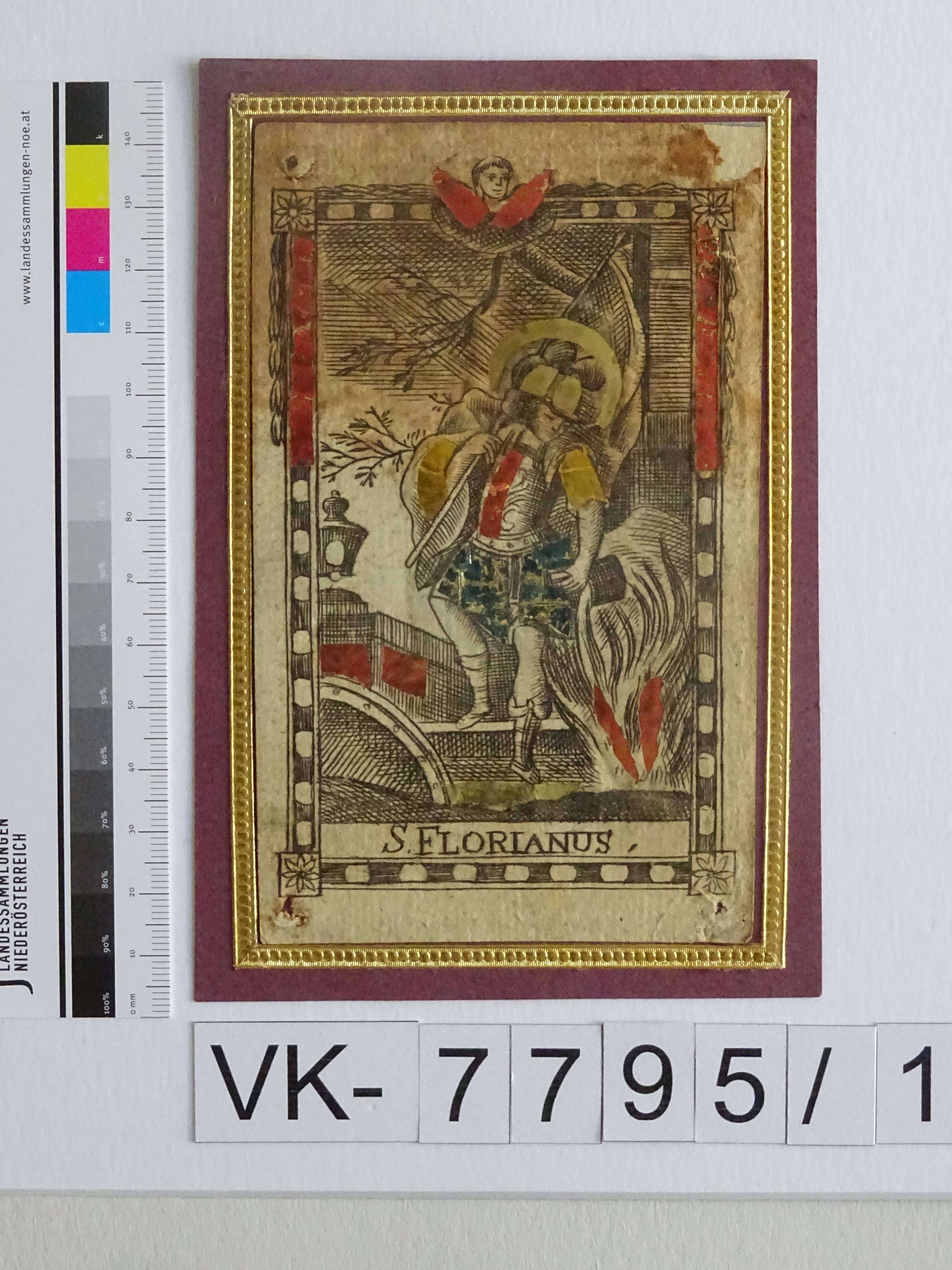 Karnabrunn; Hl. Florian; verklebt auf Karton; Eintrag Inventarbuch: "Andachtsgrafik, Slg. Stergar."