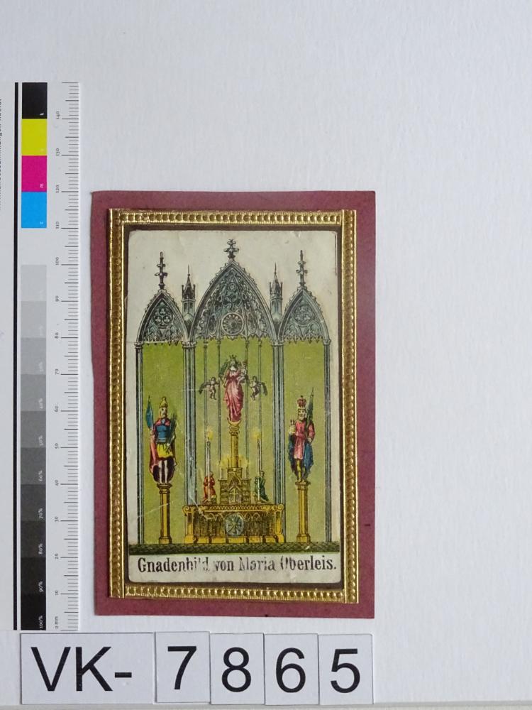Oberleis; Vorderseite: Gnadenstatue = Maria mit Kind (Mariensäule, Himmelskönigin); verklebt auf Karton; Eintrag Inventarbuch: "Andachtsbildchen, Slg. Klar."