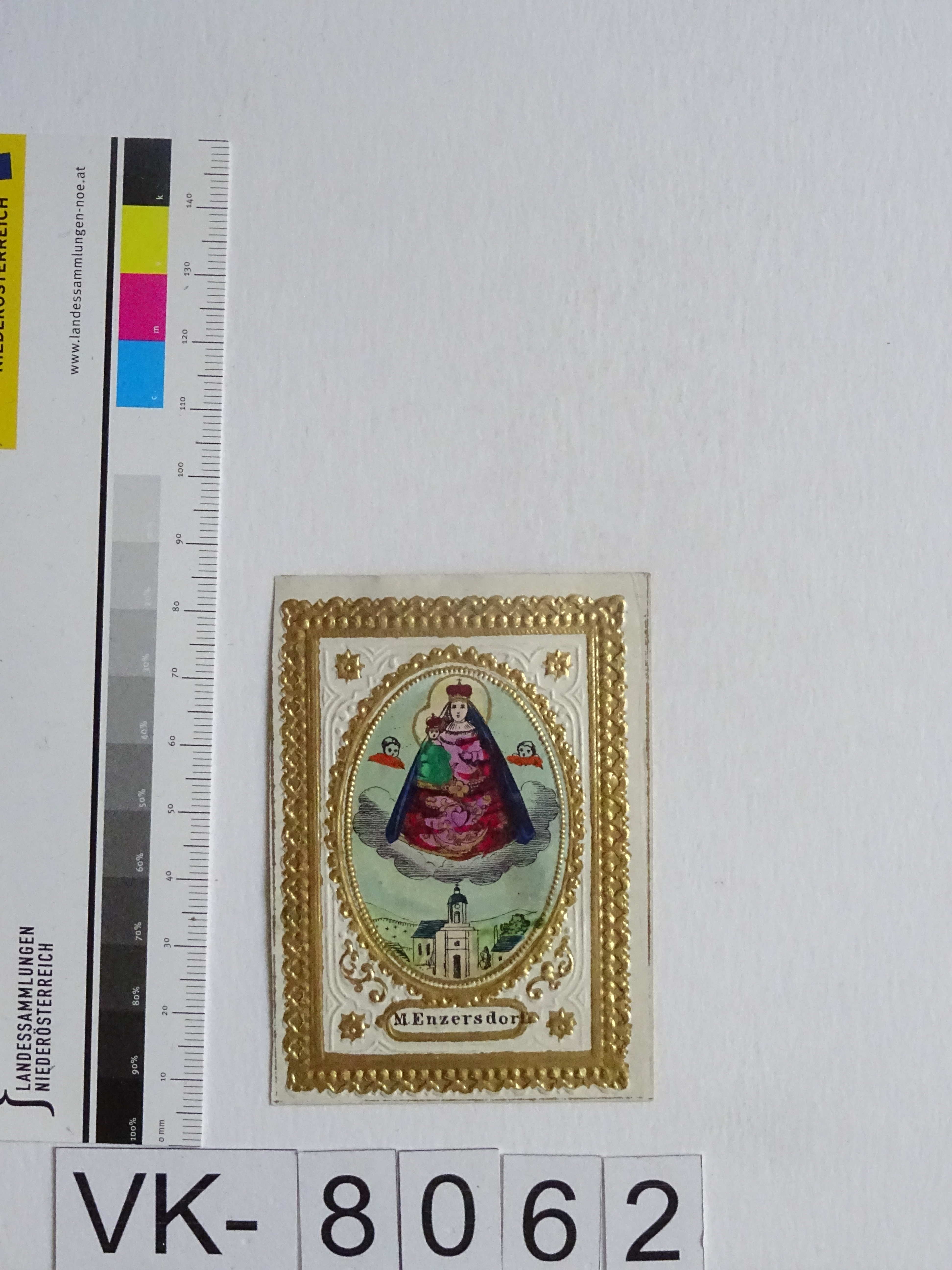 Maria Enzersdorf, "Maria Heil der Kranken"; Vorderseite: Gnadenstatue = Maria mit Kind, Wallfahrtskirche; Eintrag Inventarbuch: "Andachtsbildchen, Slg. Klar."