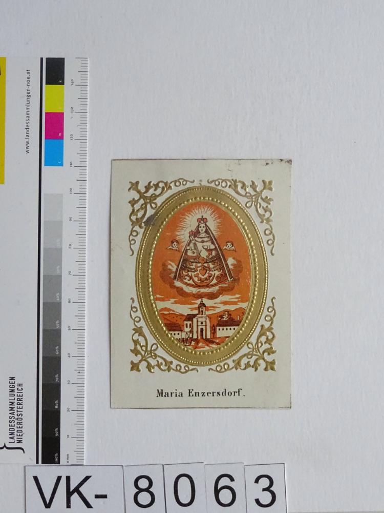 Maria Enzersdorf, "Maria Heil der Kranken"; Vorderseite: Gnadenstatue = Maria mit Kind, Wallfahrtskirche; Rückseite: handschriftlich "16."; Eintrag Inventarbuch: "Andachtsbildchen, Slg. Klar."