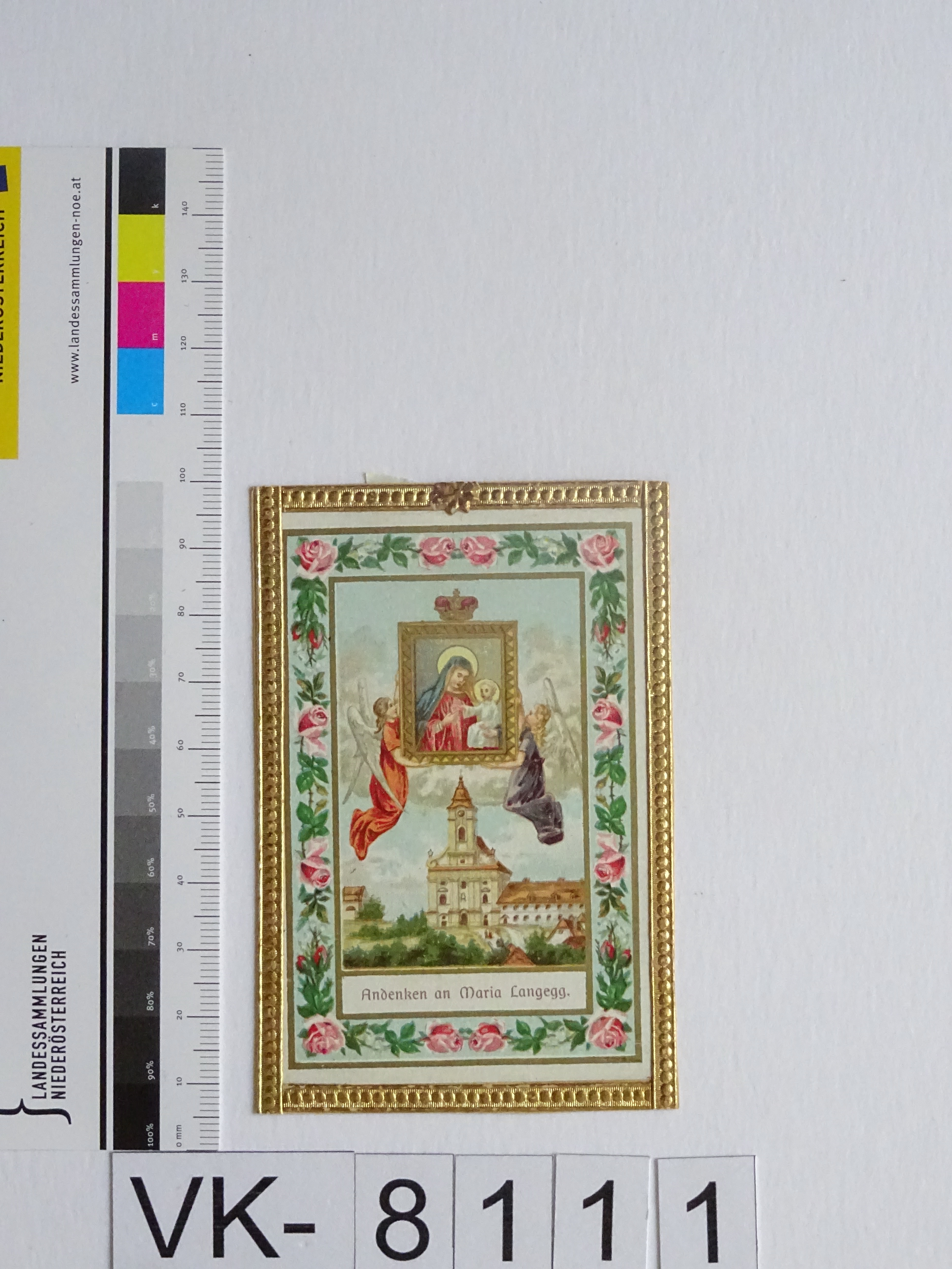 Maria Langegg, "Maria - Heil der Kranken"; Vorderseite: Gnadenbild = Maria mit Kind, Wallfahrtskirche, Blumen (Rosen); auf Karton verklebt; Eintrag Inventarbuch: "Gebetszettel, Slg. Klar."