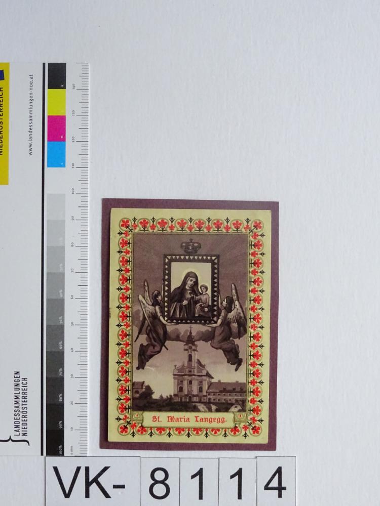 Maria Langegg, "Maria - Heil der Kranken"; Vorderseite: Gnadenbild = Maria mit Kind, Wallfahrtskirche; Rückseite: "Gebet","Verlag von Gregor Fischer, Innsbruck"; auf Karton verklebt; Eintrag Inventarbuch: "Gebetszettel, Slg. Klar."
