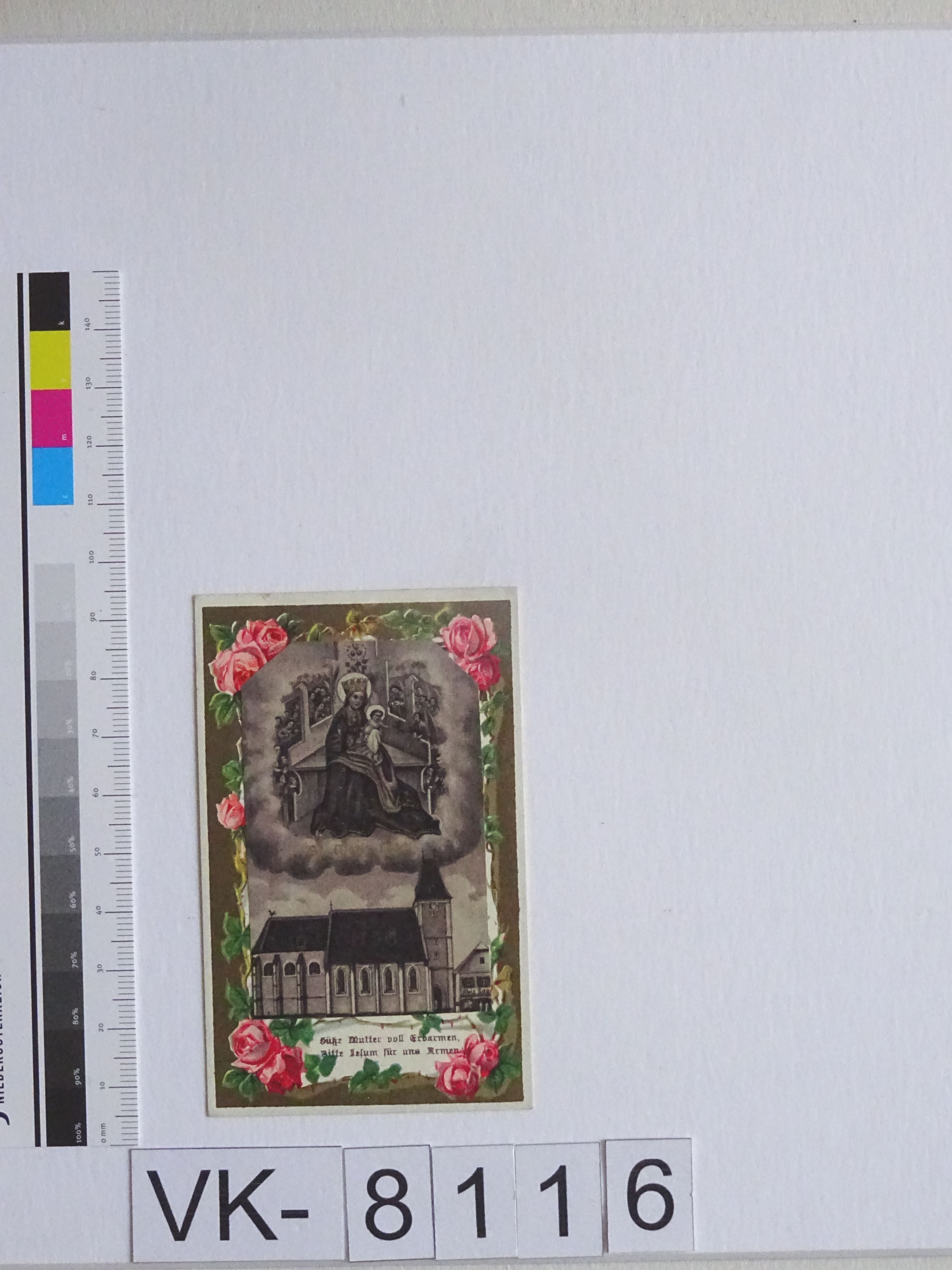 Maria Laach am Jauerling, Unserer Lieben Frau sechs Finger; Vorderseite: Gnadenstatue = Maria mit Kind, Wallfahrtskirche, Blumen (Rosen); Rückseite: "Gebet", "Ars catholica"; Eintrag Inventarbuch: "Gebetszettel, Sammlung Klar."
