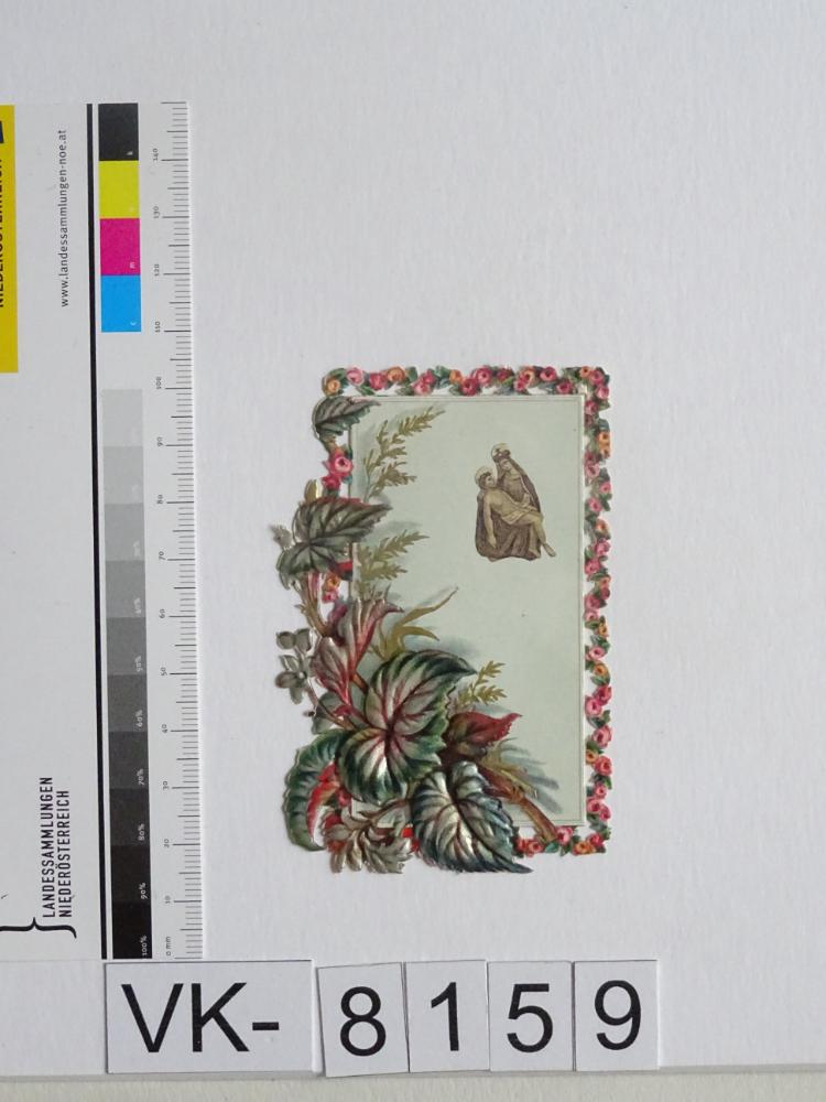 Maria Lanzendorf, "Sieben Schmerzen Mariens" Vorderseite: Gnadenstatue = Pietà, Blumen (Rosen, Blätter); Rückseite: Gebet "Gnadenreiche Mutter Jesu"; Eintrag Inventarbuch: "Gebetszettel, Slg. Klar."