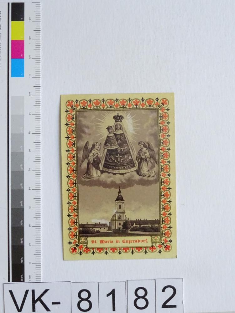 Maria Enzersdorf, "Maria Heil der Kranken"; Vorderseite: Gnadenstatue = Maria mit Kind, Wallfahrtskirche; Rückseite: Gründungsgeschichte "Ursprung vom Heil der Kranken", "Verlag Gregor Fischer, Innsbruck"; Eintrag Inventarbuch: "Gebetszettel, Slg. Klar."