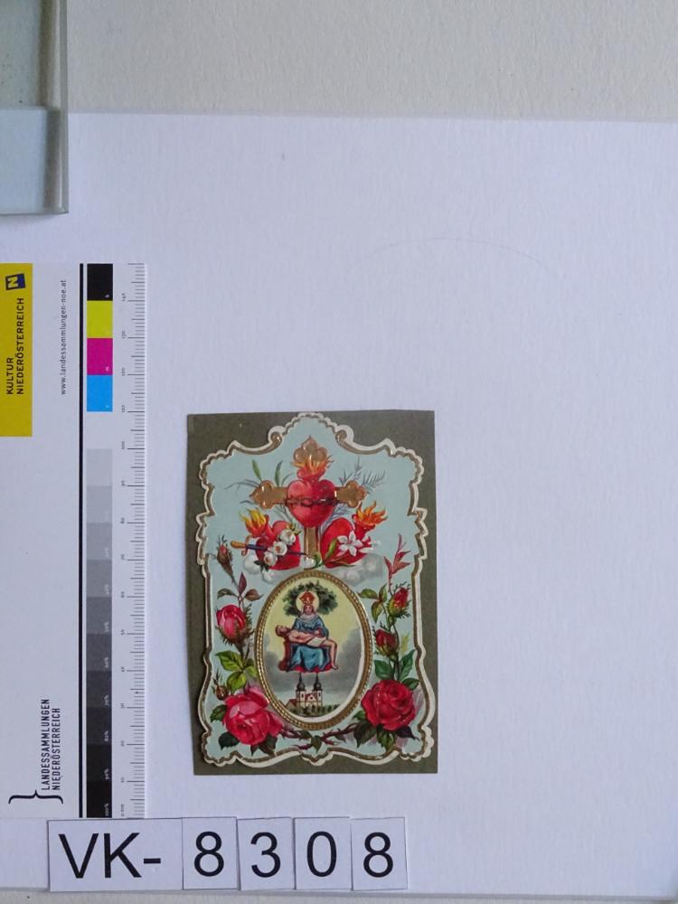 Maria Taferl; Vorderseite: Gnadenstatue = Pietà, Basilika, Flammenherz, Blumen (Rosen); Rückseite: Spruch; verklebt auf Karton; Eintrag Inventarbuch: "Gebetszettel, Maria Lanzendorf, Sammlung Klar."