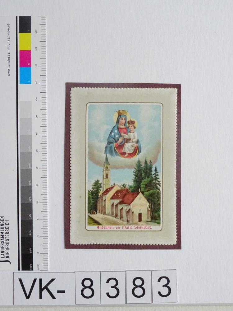 Maria Steinparz; Vorderseite: Gnadenbild = Maria mit Kind, Wallfahrtskirche; Rückseite: Gebet "Maria!", Verlag F. J. Schadek, Wien VI/I., Barnabitengasse 3", handschriftlich "ersuchen vom 11.8.23 von Eduard Müllner"; verklebt auf Karton; Eintrag Inventarb
