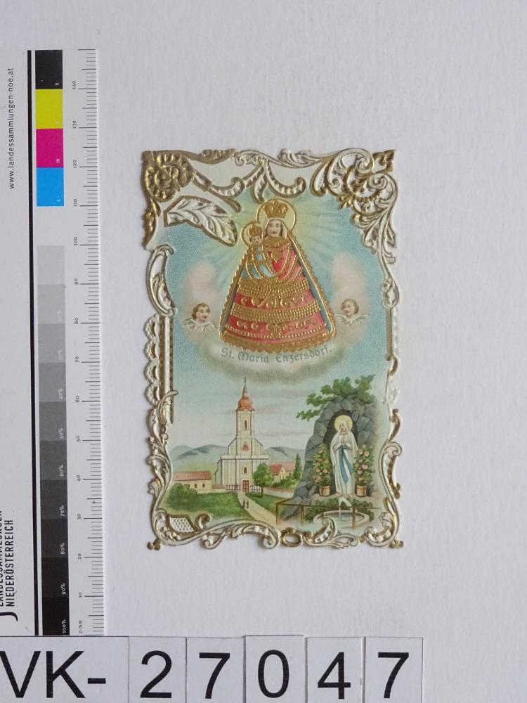 Maria Enzersdorf, "Maria Heil der Kranken"; Vorderseite: Gnadenstatue = Maria mit Kind, Wallfahrtskirche, Maria von Lourdes (Lourdesgrotte); Rückseite: "Gebet zur heiligsten Jungfrau Maria", "Verlag von Gregor Fischer, Innsbruck"