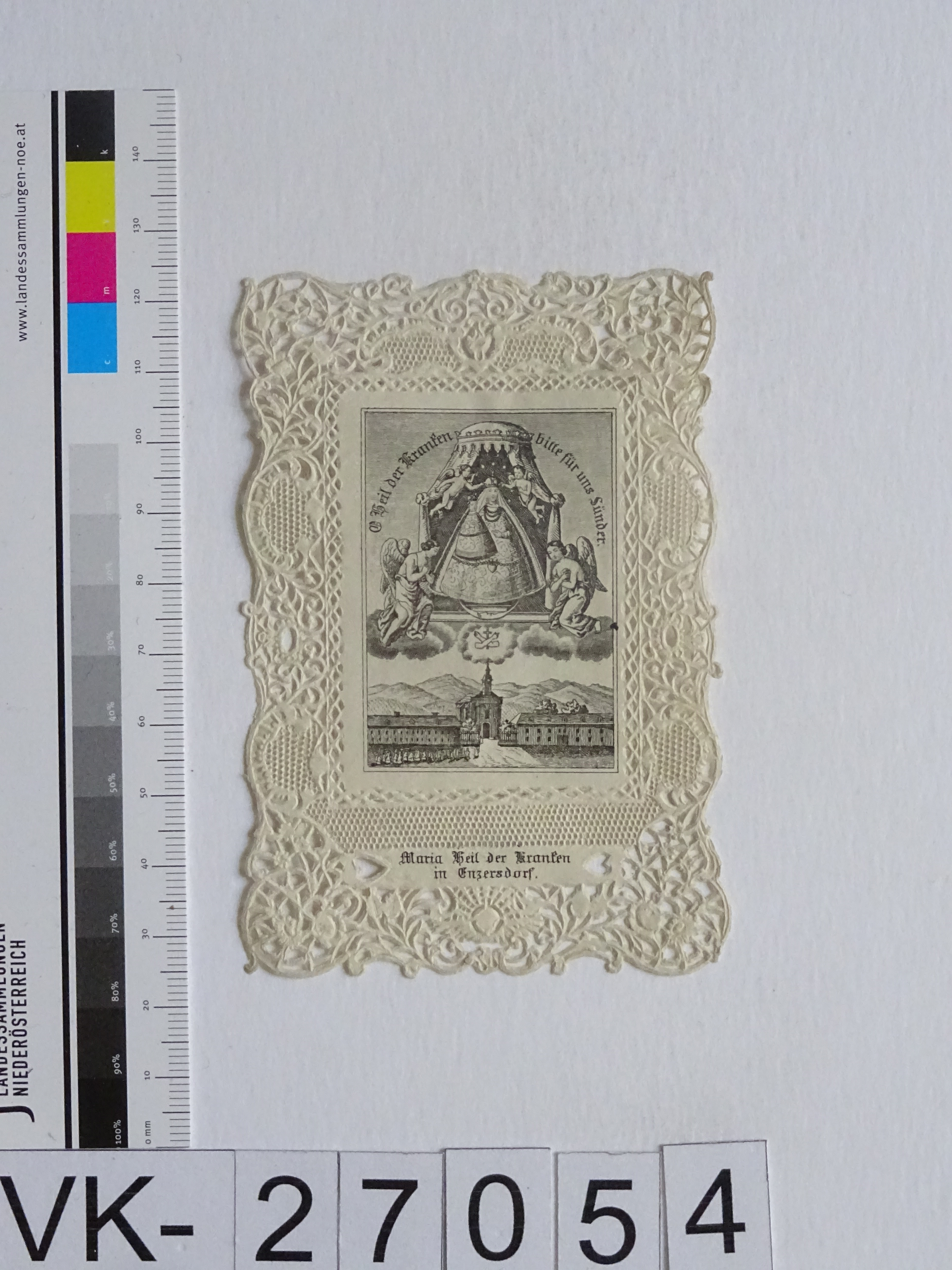 Maria Enzersdorf, "Maria Heil der Kranken"; Vorderseite: Gnadenstatue = Maria mit Kind, Wallfahrtskirche; Rückseite: "Gebet", handschriftlich "7. 9. 1874"