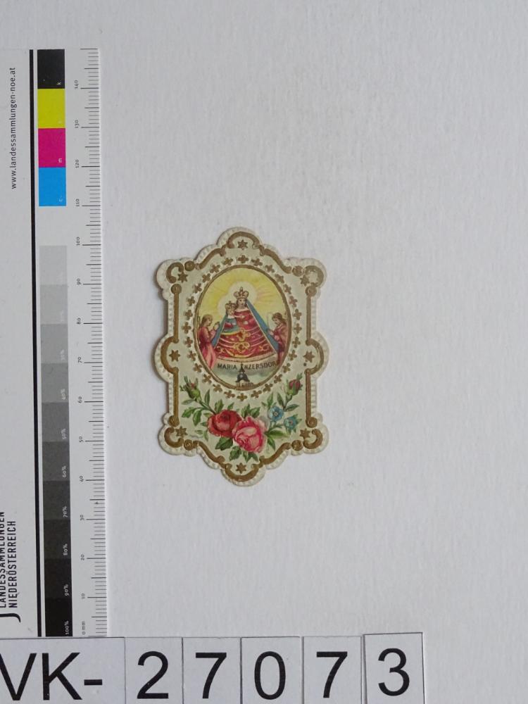 Maria Enzersdorf, "Maria Heil der Kranken"; Vorderseite: Gnadenstatue = Maria mit Kind, Wallfahrtskirche, Blumen (Rosen); Rückseite: Gebet, handschriftlich "Elise Haydin (?) 1900"