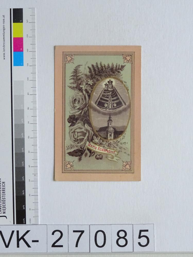 Maria Enzersdorf, "Maria Heil der Kranken"; Vorderseite: Gnadenstatue = Maria mit Kind, Wallfahrtskirche, Blumen (Rosen, Narzissen, Farne); Rückseite: "Gebet"