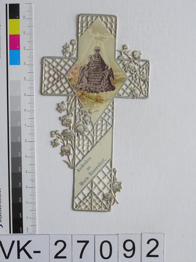 Maria Enzersdorf, "Maria Heil der Kranken"; Vorderseite: Gnadenstatue = Maria mit Kind, Blumenranke (Maiglöckchen); Rückseite: Gebet; Bildchen in Form eines Kreuzes