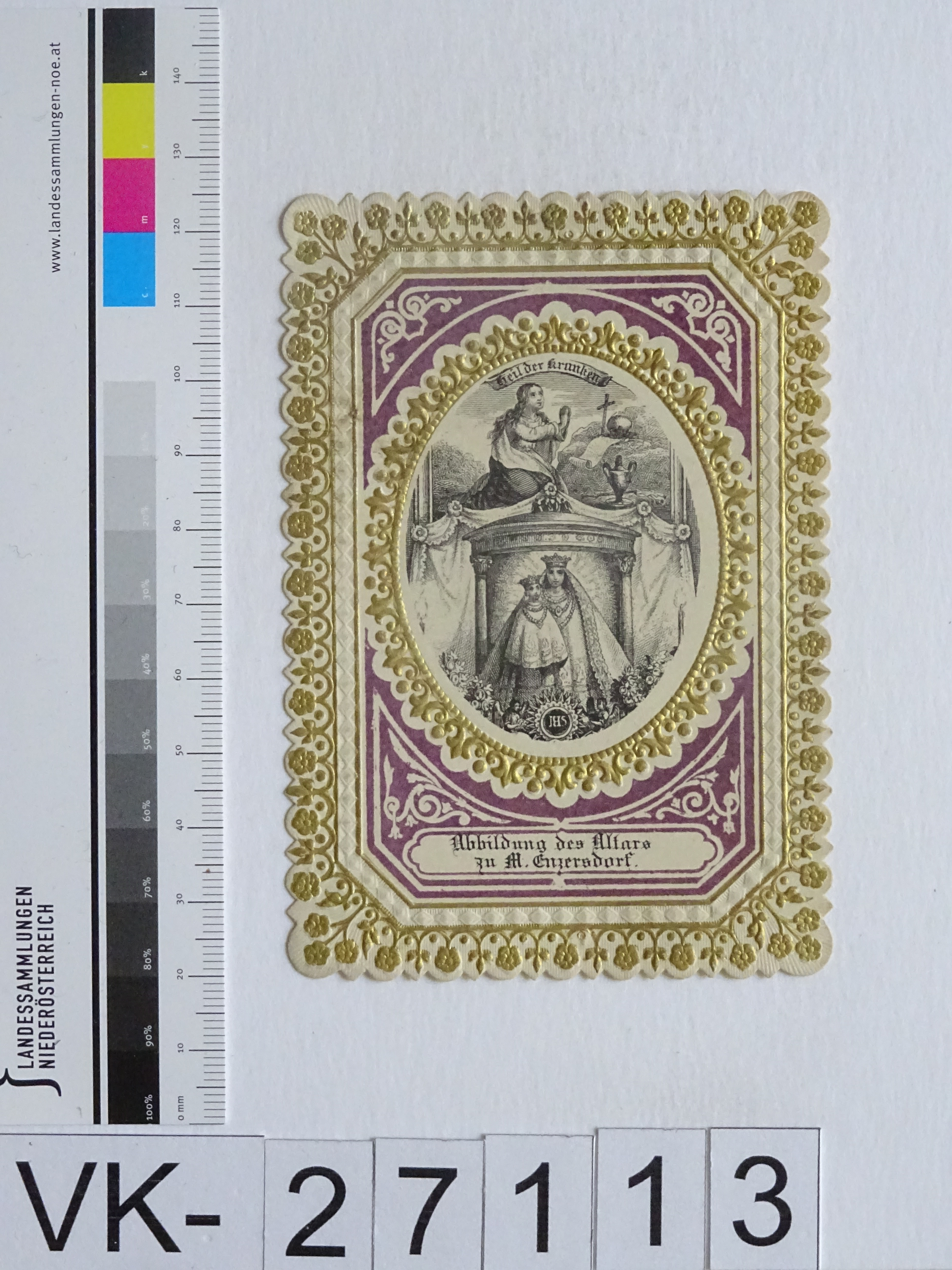Maria Enzersdorf, "Maria Heil der Kranken"; Vorderseite: Gnadenstatue = Maria mit Kind, Maria Magdalena (Büßerin); Rückseite: Gebet "Gnadenreiche Mutter Jesu"; "Bei A. Schaufele, Stuttgart"