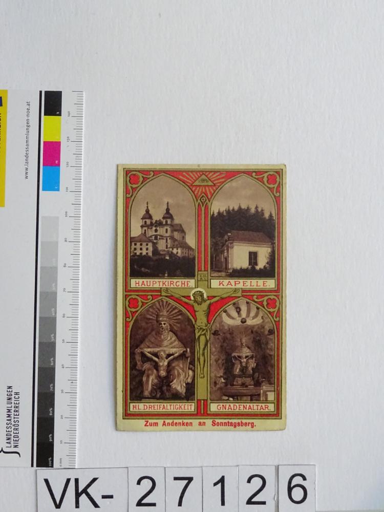 Sonntagberg; Vorderseite: Gnadenbild = Gnadenstuhl, Basilika, Wallfahrtskapelle; Rückseite: "Gebet zur heiligsten Dreifaltigkeit", "Verlag v. G. Fischer, Innsbruck"