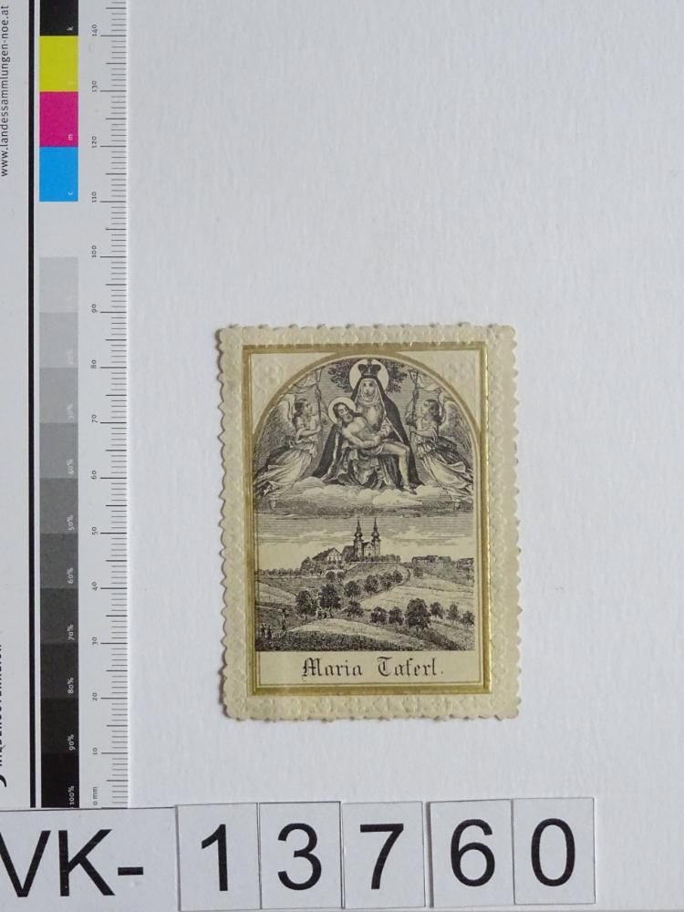 Maria Taferl; Vorderseite: Gnadenstatue = Pietà, Basilika, Engel; Rückseite: Gebet, "Bei A. Schaufele, Stuttgart", monogrammiert "FW", handschriftlich "Johann xxx (Name unleserlich)"