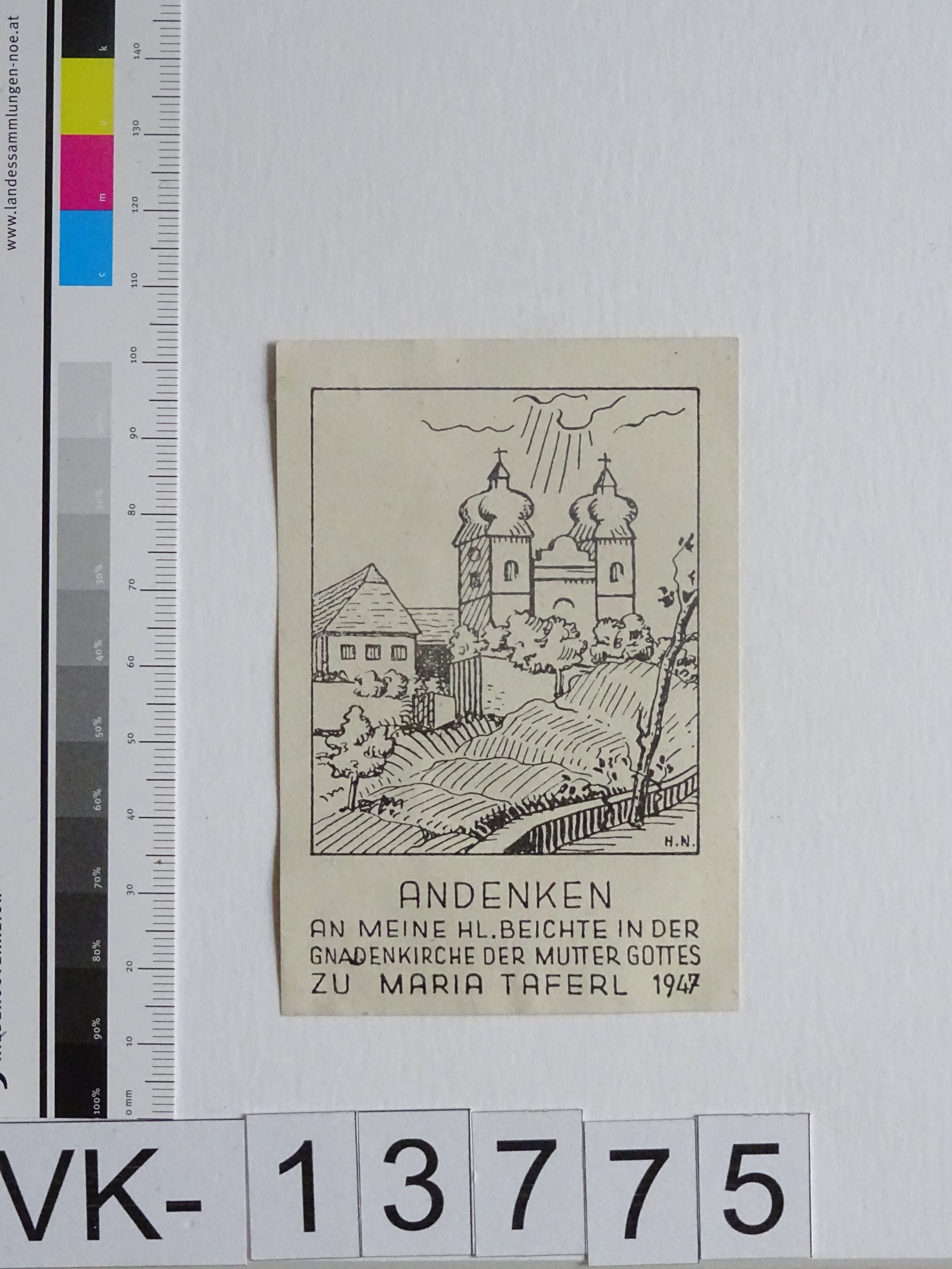 Maria Taferl; Vorderseite: Gnadenstatue = Pietà, Basilika, Engel, Spruch "1947"; Rückseite: Anweisung "Lieber Wallfahrer", monogrammiert "FW"