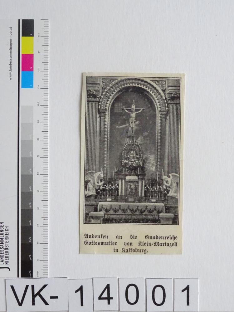 Kalksburg; Vorderseite: Gnadenstatue = Maria mit Kind, Kruzifix, Petrus in Ketten, "Andenken an die Gnadenreiche Gottesmutter von Klein Maria Zell in Kalksburg"; Rückseite: "Kräftiges Gebet in jedem Anliegen zur himmlischen Gnadenmutter"m "Buchdruckerei T