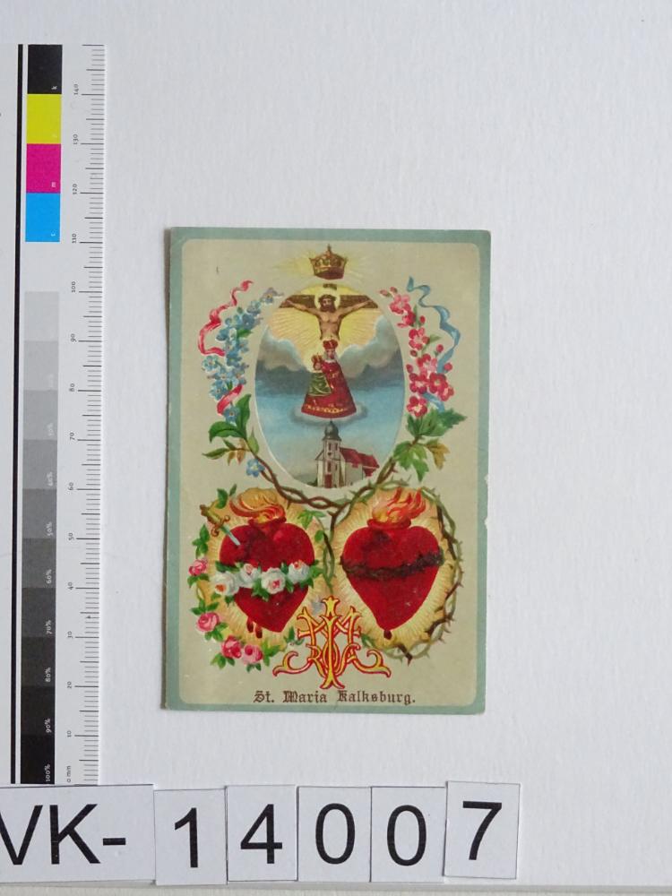 Kalksburg; Vorderseite: Gnadenstatue = Maria mit Kind, Kruzifix, Wallfahrtskirche, "St. Maria Kalksburg", Blumen (Vergissmeinnicht, Stiefmütterchen), Flammenherzen mit Dornenkrone, mit Rosen); Rückseite: "Gebet zu Maria", "Verlag v. Gregor Fischer, Innsbr