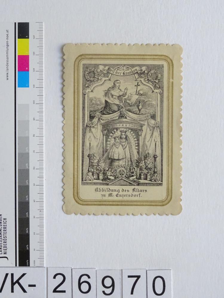 Maria Enzersdorf, "Maria Heil der Kranken"; Vorderseite: Gnadenstatue = Maria mit Kind, Maria Magdalena (Büßerin); Rückseite: Gebet "Gnadenreiche Mutter Jesu", "A. Schaufele, Stuttgart"