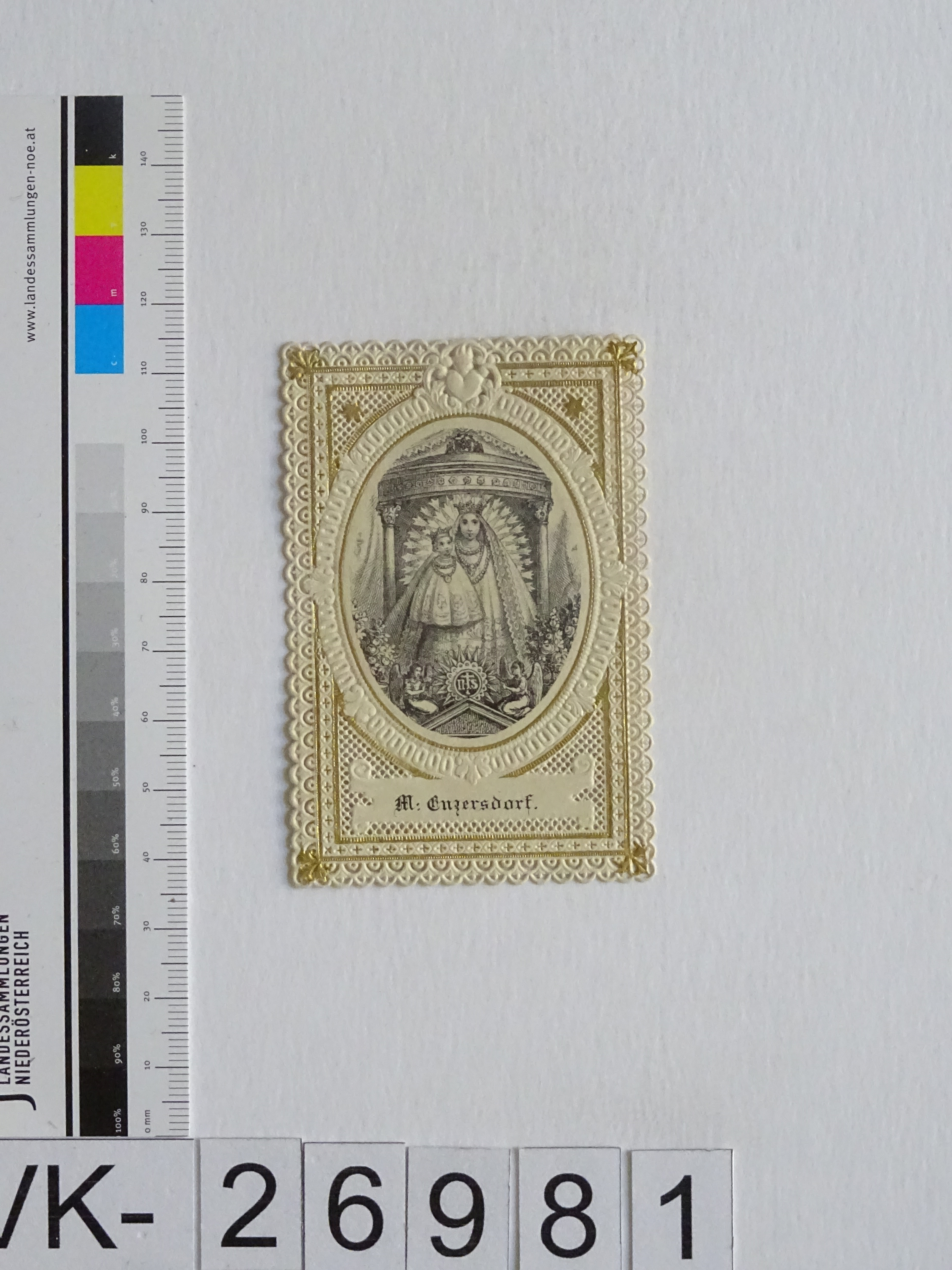 Maria Enzersdorf, "Maria Heil der Kranken"; Vorderseite: Gnadenstatue = Maria mit Kind; Rückseite: Gebet "Gnadenreiche Mutter Jesu", "A. Schaufele, Stuttgart"