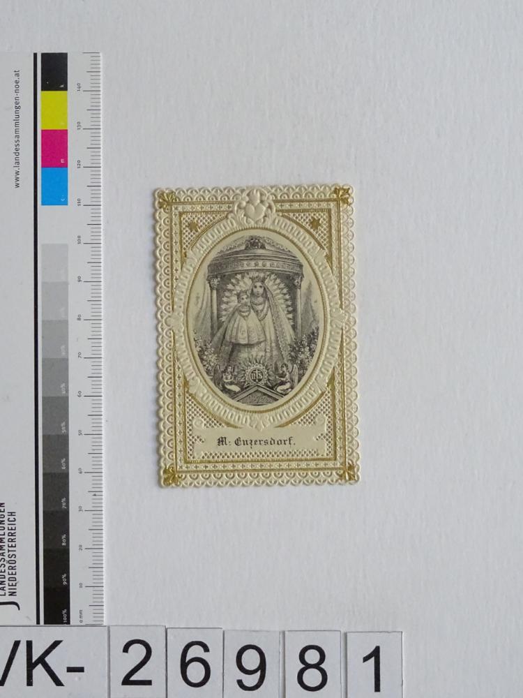 Maria Enzersdorf, "Maria Heil der Kranken"; Vorderseite: Gnadenstatue = Maria mit Kind; Rückseite: Gebet "Gnadenreiche Mutter Jesu", "A. Schaufele, Stuttgart"