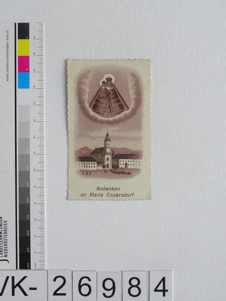 Maria Enzersdorf, "Maria Heil der Kranken"; Vorderseite: Gnadenstatue = Maria mit Kind, Wallfahrtskirche; Rückseite: Gebet "Bittruf an die Gnadenmutter", handschriftlich "Zum Andenken von Frau Hermine Wesely, 1.5.1927"